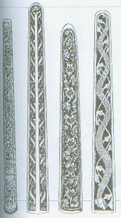 Von links nach rechts: 3 Pendok Gaya Surakarta, Pendok Gaya Bali und Pendok Bima, Nusa Tenggara. |