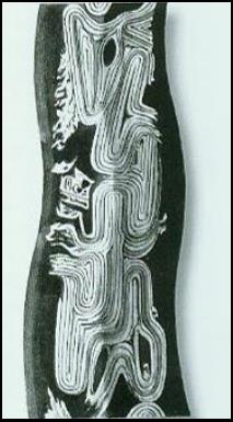 Dieses Pamormotiv ähnelt der Pamor Lawe Satukel, es hat aber eine unregelmäßigere Struktur.