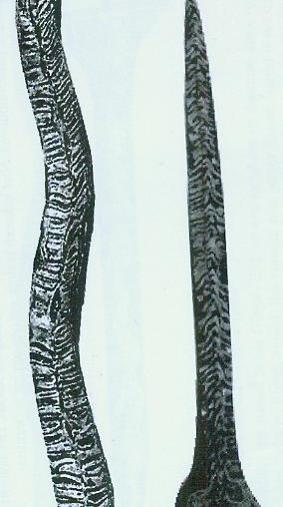 The image of pamor Ri Wader is indeed like a fishbone. If you first see it you think it is maybe pamor Blarak Ngirid or Alang Alang. The difference to pamor Blarak Ngirid is that the arms of the leaves are lying nearer to the edge of the blade. The structure of pamor Alang Alang is not as fine as it of pamor Ri Wader. Pamor Ri Wader is not so difficult to make as pamor Ron Genduru or Blarak Ngirid.