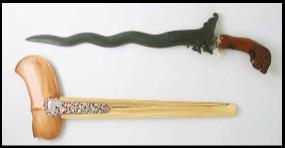 Krawangan, Keris ist eine Form eines Keris mit einer Klinge die mit einer durchlöcherten Verzierung versehen wird. Kerisliebhaber in Surakarta und Yogykarta mögen diese Form nicht. In Ost-Java, Madura und Brunei gibt es dagegen viele Liebhaber von Keris Krawangan und dort werden sie oft auch mit Gold geschmückt. |