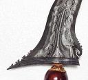 Lar Bango ist die Dapur eines Pedang Java und auch eines geraden Keris. Das Pedang ist ungefähr 85 bis 98 cm lang. Die Spitze ist spitz zulaufend und 2/3 der stumpfen Seite sind gerade. Dieser gerade Teil hat eine Kruwingan. Die andere Seite ist scharf. |