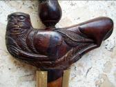 Mandau ist eine traditionelle Waffe der Dayak in Borneo. Die Klinge ist etwa 70 cm lang und an der Spitze ungefähr 6,5 cm breit, in der Nähe des Griffes nur ca. 3,5 cm. Ein Mandau hat nur eine scharfe Seite. Der Griff ist aus Holz und hat eine besondere Form und ist mit Menschenhaaren geschmückt. |