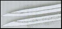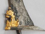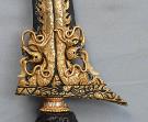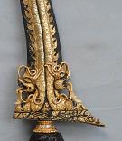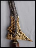 Naga, Dapur ist eine Form eines Keris, Tombak, Pedang oder eine Hinzufügung zur Klinge. Es ist dann meist nur der Drachenkopf. Bei der Dapur Naga findet man diese an der Gandik eines Keris, bei Tombak und Pedang an der Sor-Soran. Bei einem Tombak ist sie symetrisch angeordnet, in Madura verwendet man nur eine Naga. |