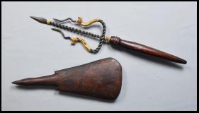 Tutup Tombak ist die Bezeichnung für die Warangka oder die Scheide eines Tombak. Diese wird benutzt, damit die Klinge sicher ist. Man kann hierzu alle Holzsorten nehmen, die nicht all zu hart sind, das sind Cendana (Sandel), Timaha, Trembalo, Awar-Awar, Suren, Cempaka Kubur und Akasia. |