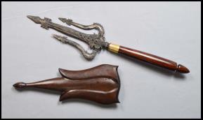 Trisula ist eine Dapur eines Tombak mit drei Spitzen. Eine Trisula kann bei den Klingen verschiedene Stile haben, es gibt gerade Klingen, 3 Luk oder 5 Luk oder eine Kombination von geraden Klingen mit gewundenen Klingen. Die Trisula ist sehr beliebt, wird aber selten neu gebaut. Eine Trisula ist ein Pusaka Tombak und wird nicht in der Praxis benötigt. Es gibt auch Trisula mit Verzierungen und Kinatah Gold. |