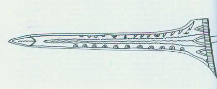 This pamor motif is formed by a series of double semicircles which are located at the edges of the blade. In the middle blade three lines run almost to the tip of the blade which has its own motive. On the Sogokan double triangles and can be found on the Ganja many lines that are arranged parallel to the blade.
