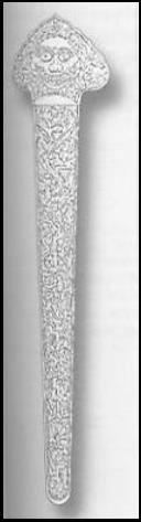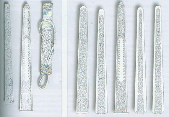 Von links nach rechts: 3 Pendok Gaya Surakarta, Pendok Gaya Bali und Pendok Bima, Nusa Tenggara. |