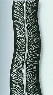 The imgae of pamor Ron Pakis is like leaves of a fern. It is nearly pamor Blarak Ngirid with openings at the edge of the leaves and pamor Ron Genduru Sinebit. The difficulty to make pamor Ron Pakis is approximately directly to pamor Ron Genduru and Blarak Ngirid. It is more rarely and so it is expensive. In some areas Ron Pakis and Ron Genduru are called Bulu Ayam (chicken feathers).